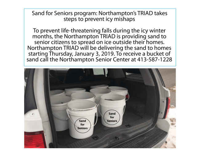 Northampton TRIAD will be delivering the sand to homes starting Thursday, January 3, 2019. To receive a bucket of sand call the Northampton Senior Center at 413-587-1228.