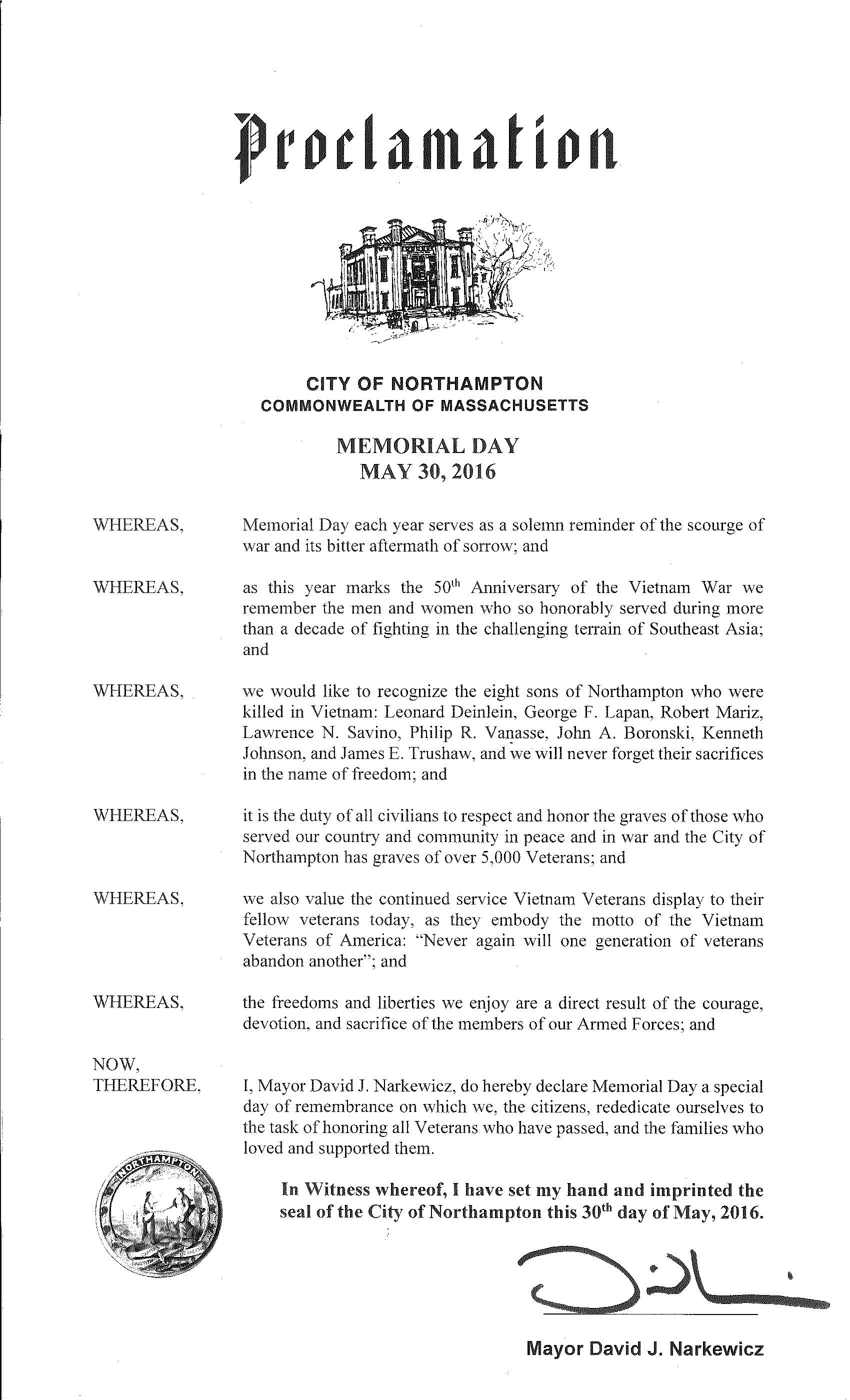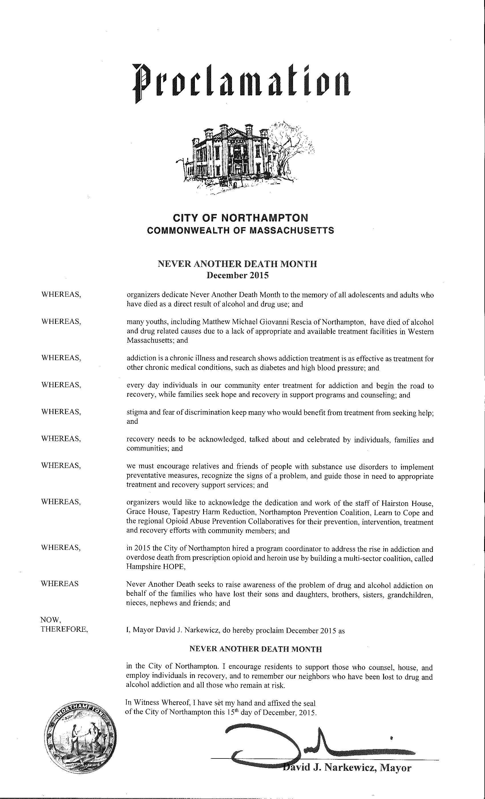 Proclamations are printed on the official letterhead with the seal of the City of Northampton and are presented at the requested event and posted on the City of Northampton website. Approval process is not automatic. The Mayor reserves the right to approve or deny any request. For more information, contact the Mayor’s Office at mayor@northamptonma.gov or by calling 413-587-1249.